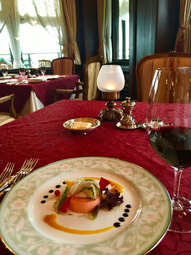 夕餉。フレンチ。メインダイニングルームのリヴァージュにて。これはパプリカのババロア、ホタテ貝添えだと。旨し…まぁ、咳をしても1人だけどな。