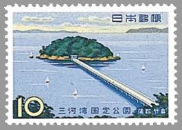 これは1960年発行の三河湾国定公園の切手。この切手、竹島、おそらくは、このテラス席からの眺めをもとに描いたんだなと思った。きっとそうだよ。だってここより高台、蒲郡にはないからな。間違いないよ。う~む。これには感動・・・