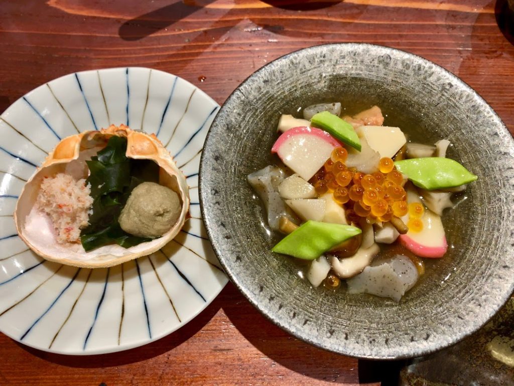 左は突き出しで、なんと、小ぶりのズワイガニの蒸し物。蟹の身とかに味噌。とんでもなく美味し。みぎはのっぺ汁。新潟の郷土料理。旨しでした。