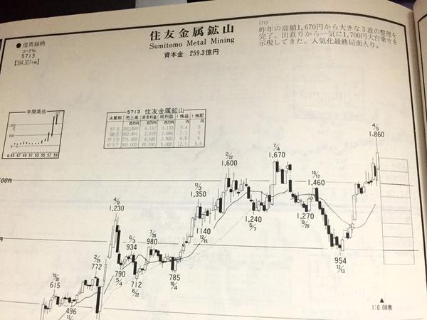 この頃の主力銘柄の1つ。別子こと、5713住友金属鉱山。「金と銀」のうち、「金」とは産金株のこと。 「日本で金が出た!鹿児島の菱刈鉱山!」ということで、テーマ株的に相場になった。是銀もこの銘柄で、大儲けした。
