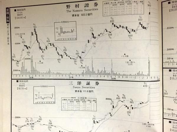「銀」は銀行株。でも何故かこのチャートブックに、銀行株は掲載されていない。当時銀行株の株価は管理されており、かつ小動き。極論すれば、株とはみなされていなかった。それが動き出し、上昇に転じたのが、1984年。同様の動きをしている、証券株のチャートを。銀行株、損保株も同様の動きだった。