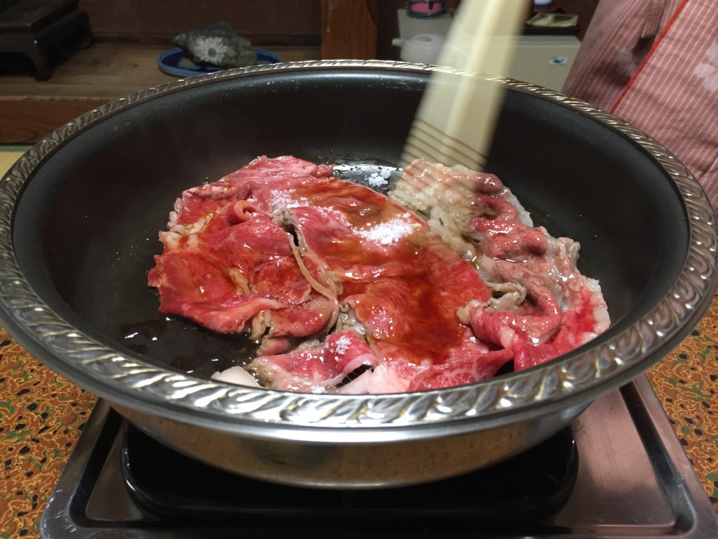 松阪牛のすき焼き。関西風の焼き方。まず肉を焼き、途中で砂糖を加える。しばらくして醤油を入れ、味を整える。