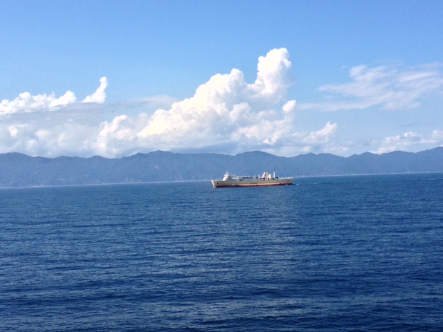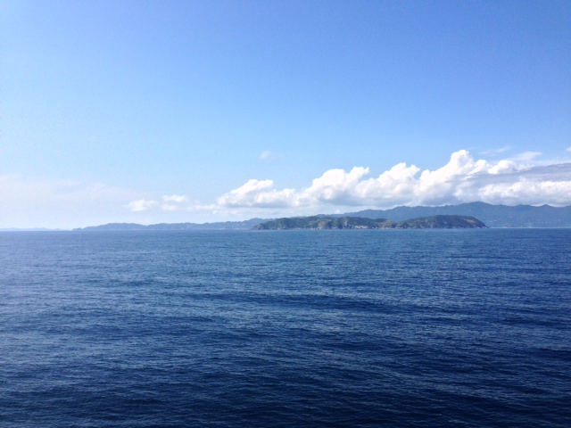 この日は気温が30度以上と高かったが、甲板の上は、そう暑くない。海風が涼しいからだろうな。概ね快適、やや暑いくらい。当方はずっと甲板に出ていて、海を見ていた。前回このフェリーに乗ったときは、9月後半。その時は甲板の海風が、少し肌寒く感じるくらいだったな。