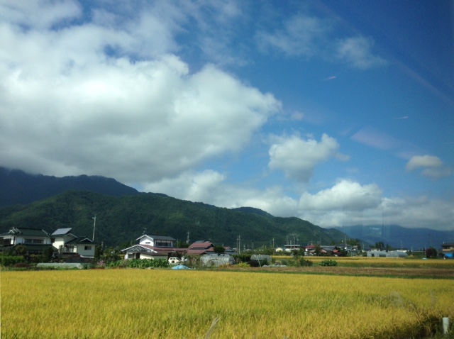 大糸線、稲尾駅が近づいてくる。見えてくる山は低くなるが、位置的にはかなり北の高地。そのせいか、稲はまだ刈り取り前だった。