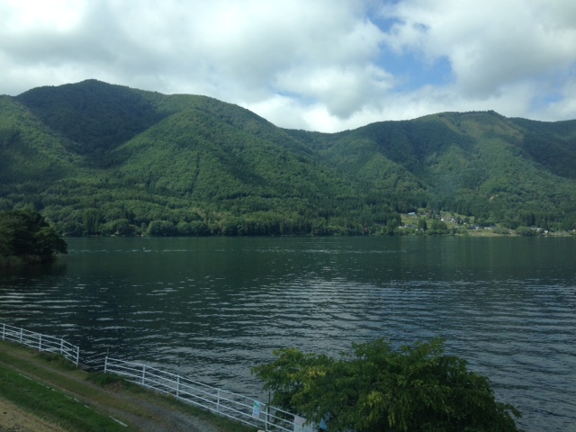 しばらくすると木崎湖が。大糸線、稲尾駅近くの車窓から見えてくる、森の中の湖。深い緑の湖・・・きれいだよな。