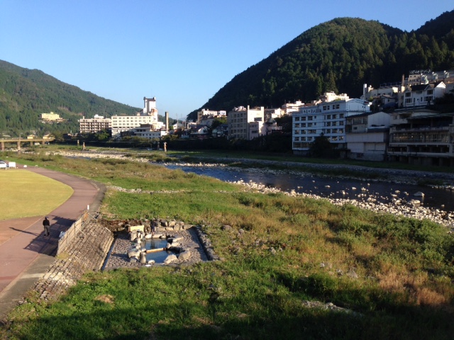 天気がいいな!翌日の朝、噴泉池にまた来てみた。あらためて、下呂温泉の素晴らしい泉質が味わえた。最高!!