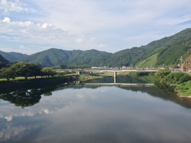 下流にかけては流れが急になるが、上流は穏やか。そこになんと、天然の大きな鮎がたくさん泳いでいた。ちょっと、壮観なくらいな。その鮎を狙って、釣り人たちが、川の中に入って竿を振る。これは釣れるだろうなぁ。