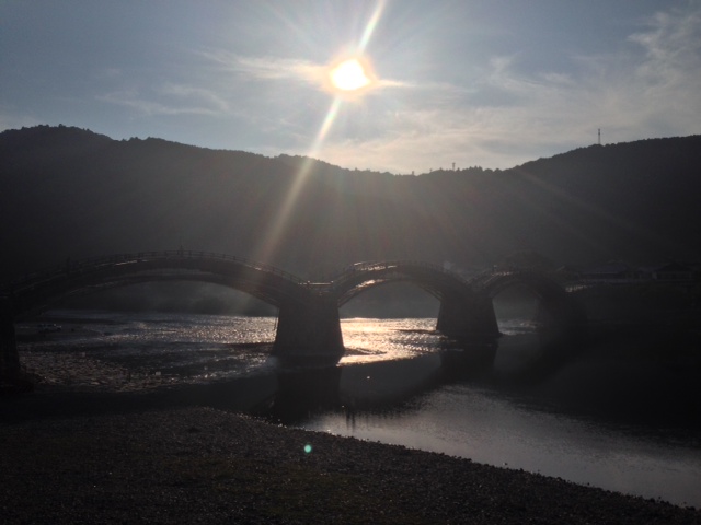錦帯橋を、逆光で撮ってみた。きれいなシルエット。これはこれで、別の良さがあるよなぁ。