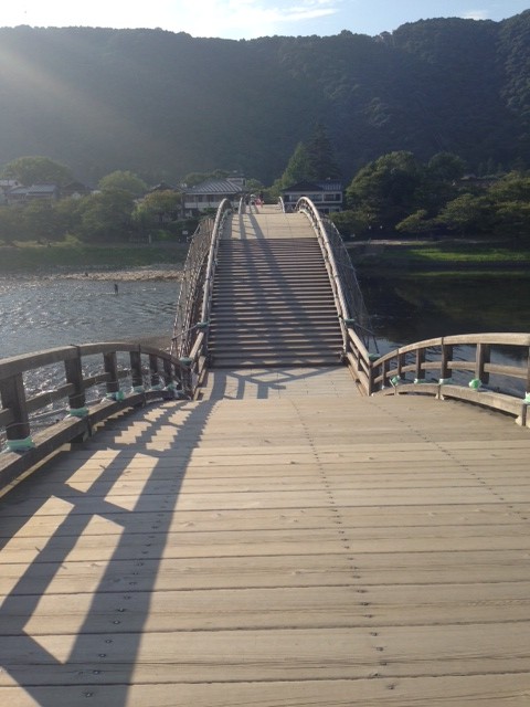 錦帯橋を渡ってみる。アーチの所、こんな階段状になってるんだな。上り下りの高低差が、結構あるな。