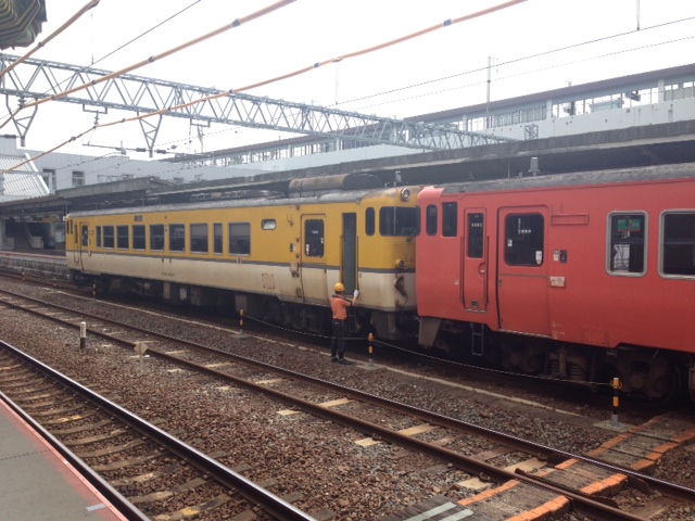 徳山駅にて。これは岩徳線の気動車。全く色合いの異なる車両を2両つなげてるが…中国地方の気動車、こういう編成もたまに見かける。関東の電車なら、考えられないよなぁ。