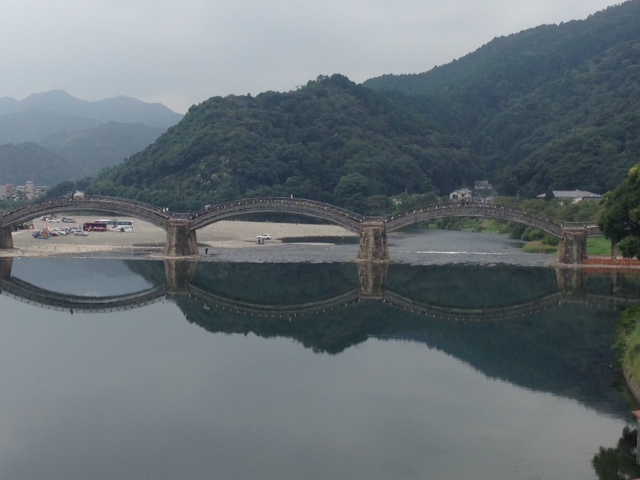 翌朝。錦帯橋のあたりを散歩。天気は今一つだが・・・錦帯橋が水面に映っていて、上下対称に見える。面白い写真が撮れたもんだ。なんだか、長崎のめがね