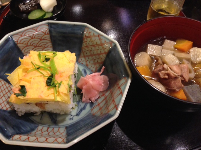 左は、岩国寿司。この地の保存食だそうな。鯖や鯵などの魚の身をほぐして混ぜ込んだ酢飯に、椎茸、レンコン、錦糸卵などを載せて、上から圧縮して作り上げる。独特の大きな押し枠を使って、寿司職人が白足袋を履いて寿司の上に乗って、ご飯を足踏みして、「押して」作るらしい。一度に5から6升、約150人分を六段に重ねて作ると。右側の汁物は、「大平」と呼ばれる、岩国で食べられている筑前煮と。両方とも、旨しだったな。