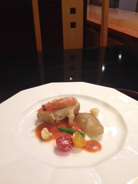 ホテルの中、「料亭・桜茶屋」というところで、懐石料理をいただく。まずは前菜。じゃがいも、メークイーンの釜焼き。小ぶりな海老も乗っていて、実に旨しだった。