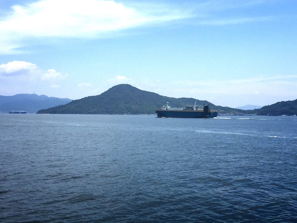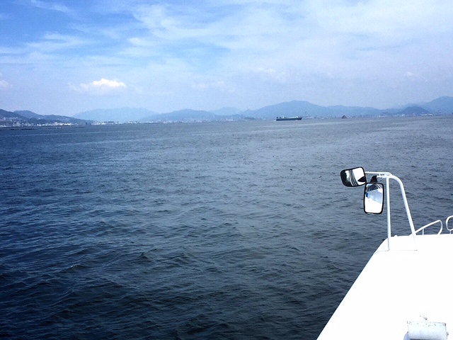 船からの景色。いつもどおりの揺れの少ない、凪の海の瀬戸内海。船の旅は、快適そのもの。だんだんと・・・宮島が遠くなるなぁ。