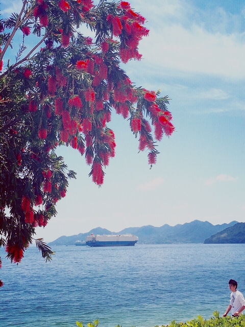 ホテルの周りの景色。この木の名前はわからないが・・・赤い花が咲いていて、海の青・空の青とよく合う。 70年代後半にエアサプライというバンドがあったが…その世界をイメージした。潮の香りもするし、甘い花の香りも漂っている。なんともリラックスできそう。