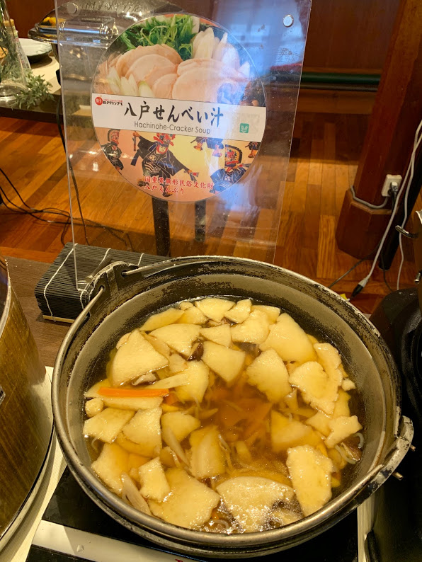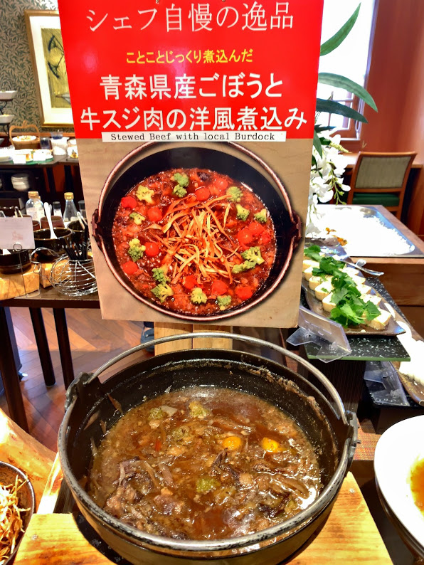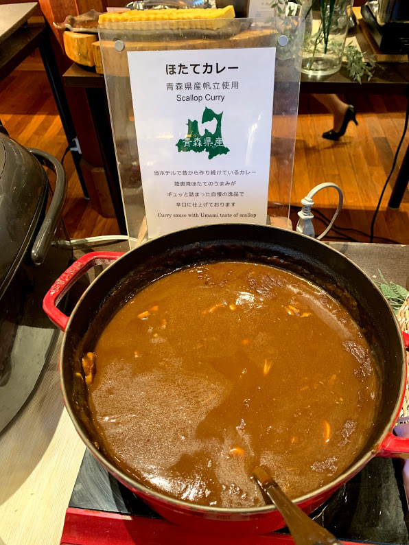ビュフェの大鍋料理。せんべい汁、ホタテ貝カレー、ごぼうと牛筋煮込み。いずれも美味いし、おもわず自分でついで食べたくなるディスプレイ。このあたりも上手だよな。