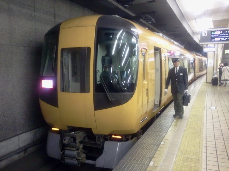 近鉄名古屋駅にて。これからこの特急鳥羽行に乗って、津まで。当方、近鉄はあまり詳しくないが・・・新型車両なのかな。なんだか蝶の幼虫のように、スタイルが丸っこいな?