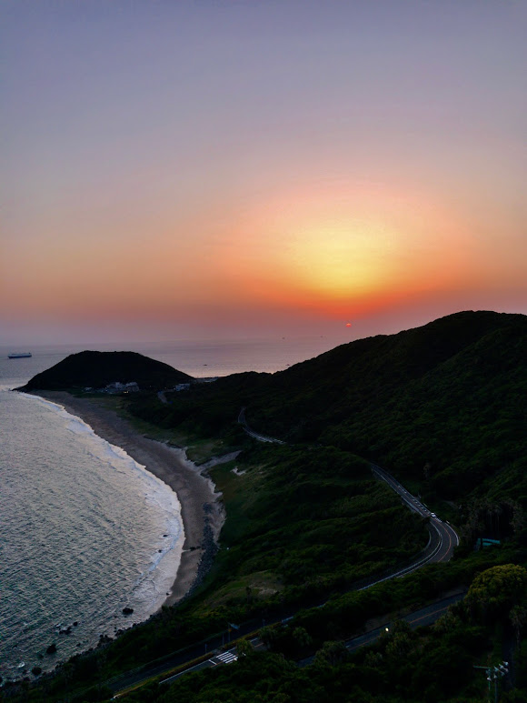 定点観測。上は昨日の渥美半島で先端は伊良湖岬越しに三河湾方面の夕焼けを望む。下は同じ景色を翌朝の早朝に。
