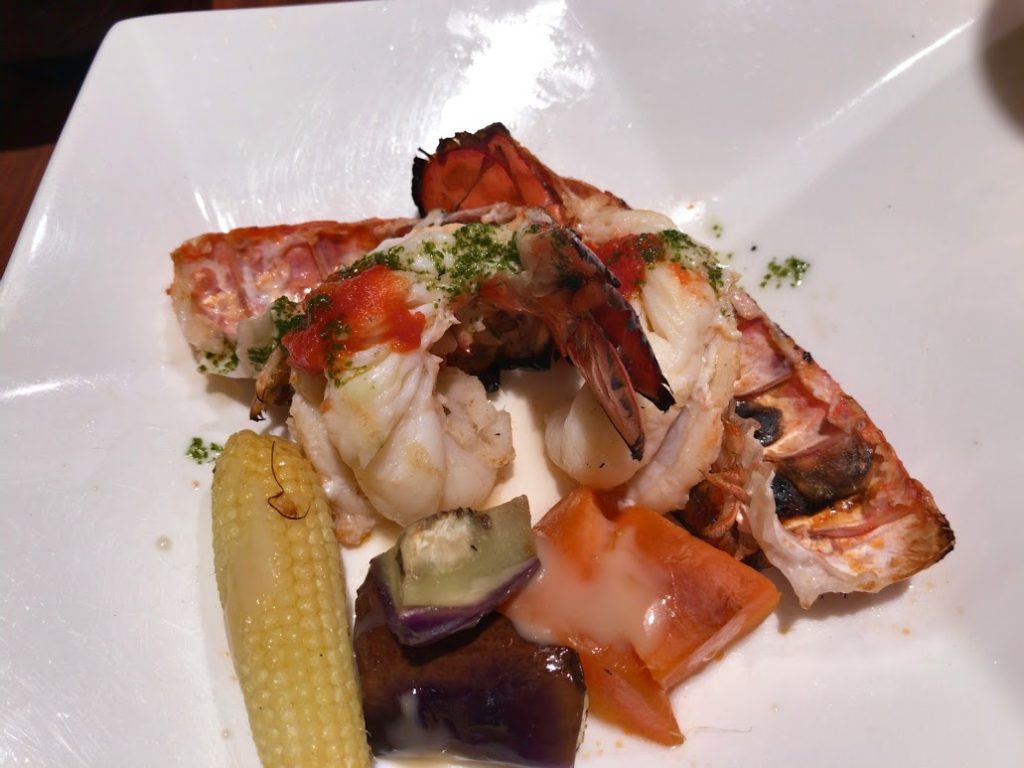 夕餉。ビュフェなんだが、それとは別にお造りとオマールエビの焼きものがついている。