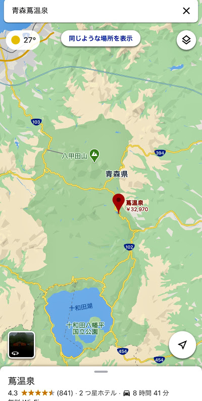 八甲田と蔦(つた)温泉旅館の位置関係ですね。いずれも、十和田八幡平国立公園の中だな。