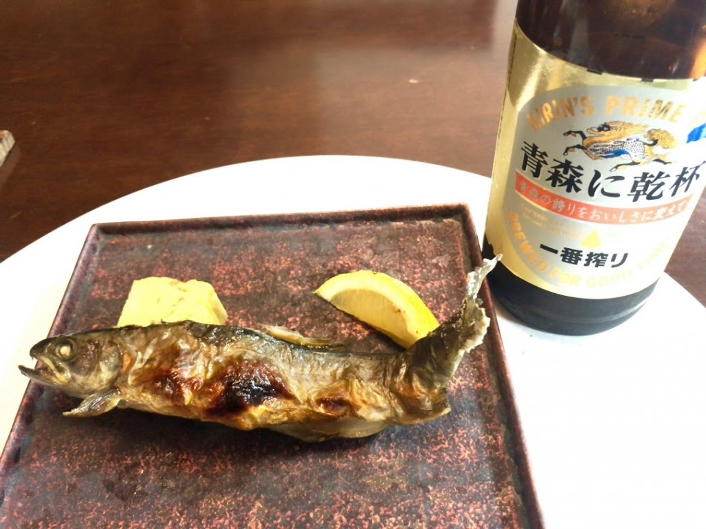 イワナの塩焼き。もちろん地のもの。「青森に乾杯」ビールとよく合う。