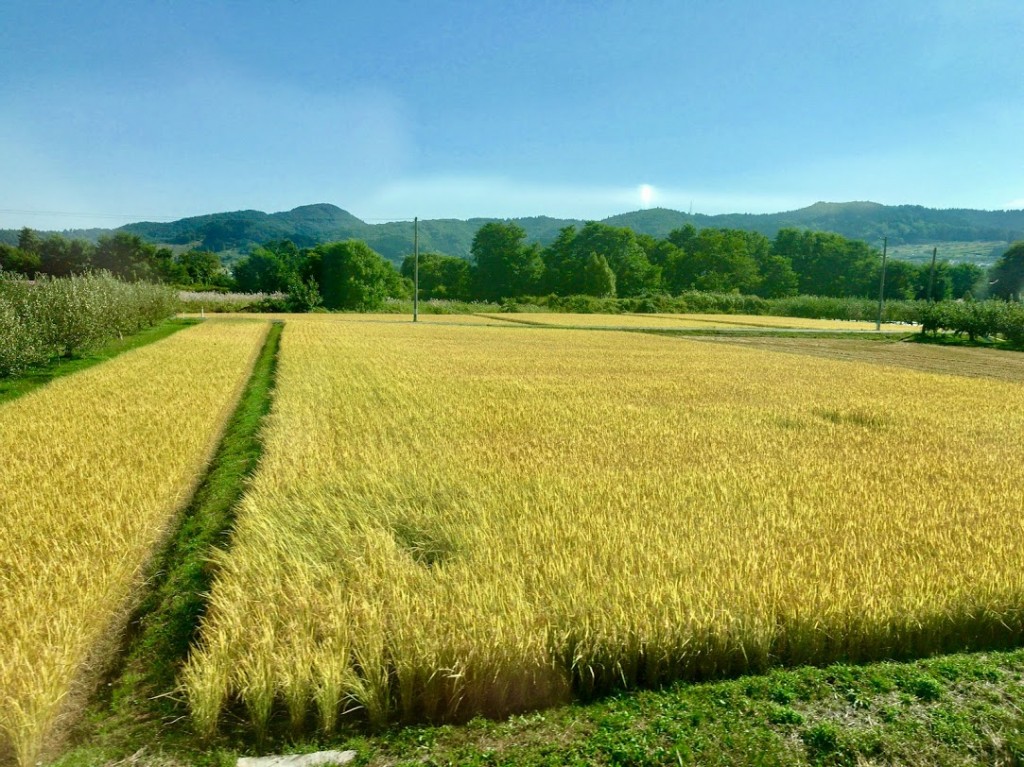 奥羽本線。弘前から駅の間。稲が実ってる。刈り取りの時期が近い。きれいだよな。