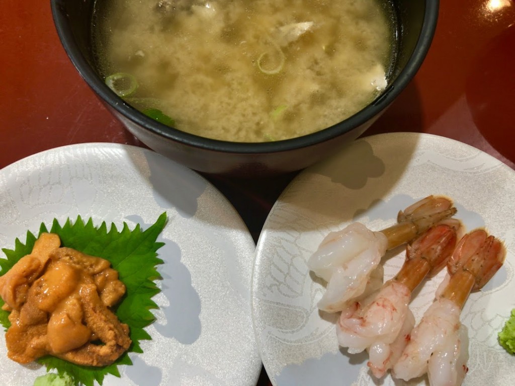 もうお腹がかなりいっぱいだが…追加でお造りを。三陸のウニと、地のものエビと、地元で言うあら汁、ジャッパ汁を。う〜む。しみじみ旨しな。