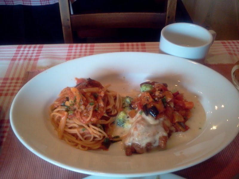 右は鶏のグリル。左は、こカブとツナのトマトパスタ。暖かいヴィシソワーズも、ついてる。やはりおいしいな。