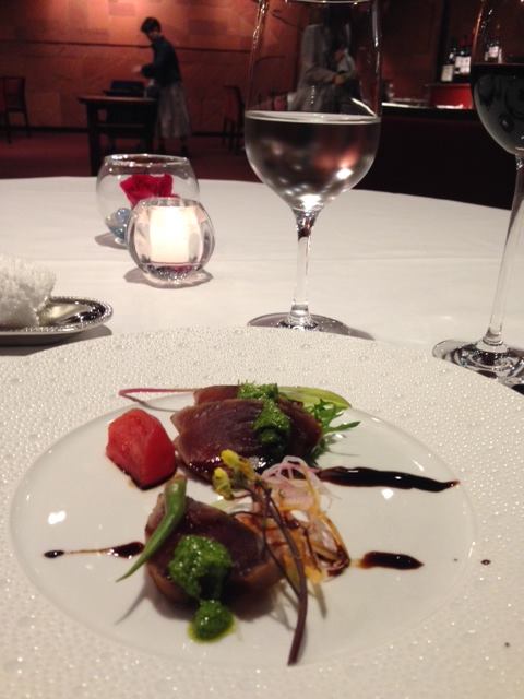 コースの始まり。前菜。手前はスズキの南蛮漬け、向こうはカツオのたたき。添えられた野菜ともども、バルサミコソースでと。赤ワインに合うな。