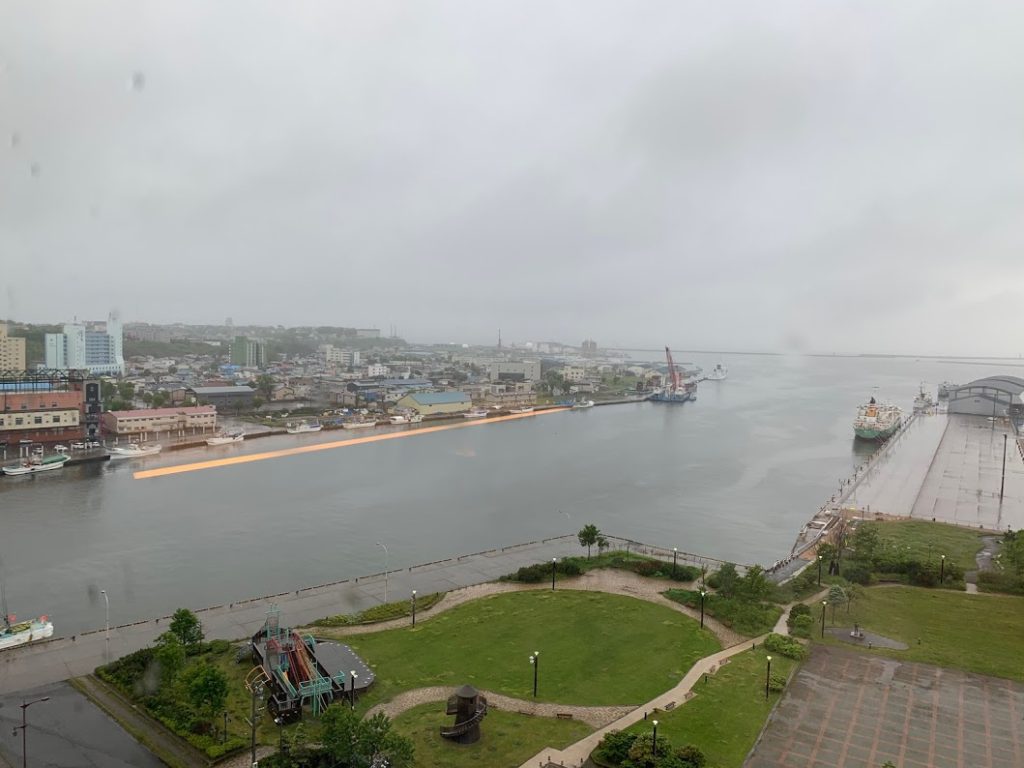ホテルの部屋からの景色。釧路川が太平洋に注ぐところだけれども。霞んでるな…