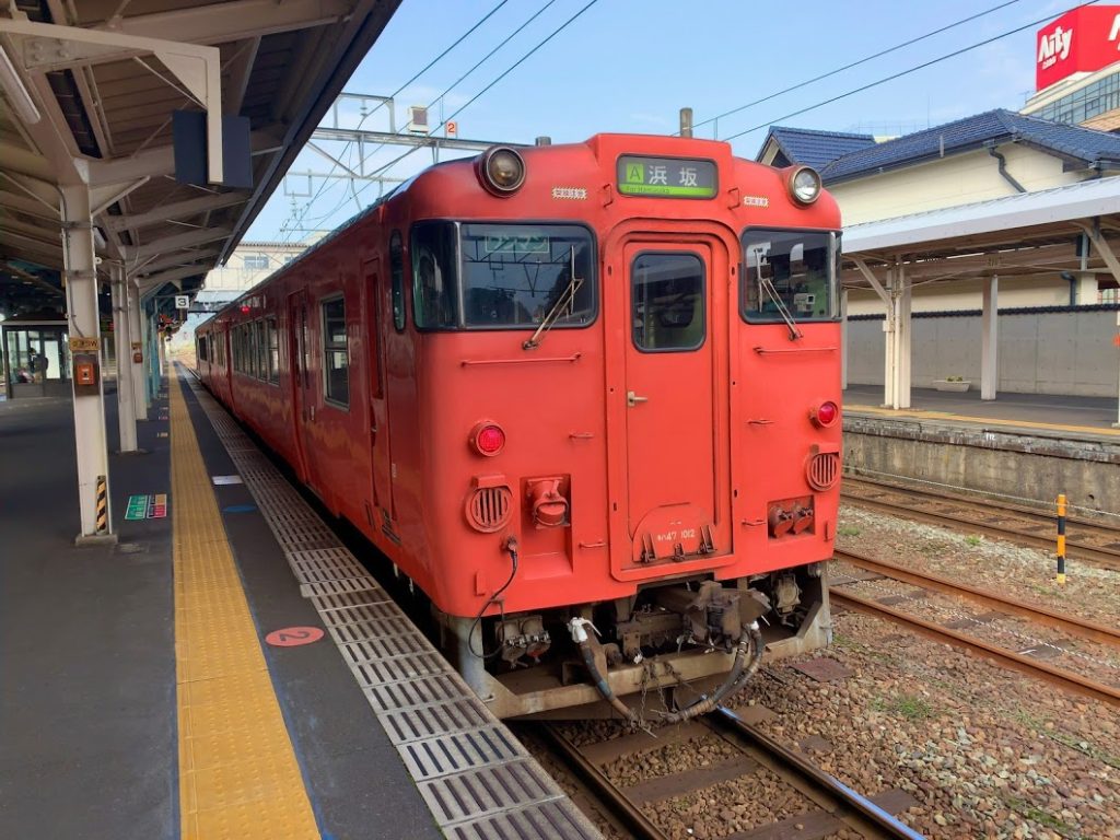豊岡に到着。実はこの浜坂行きキハ47気動車鈍行に乗り換える頃から、旅のムードが一変する。まず、天気が晴れてきた。日本海が近くなる!自分のテンションが高くなってくるのがよくわかる。そして: