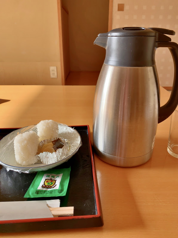 そしてこれは前回宿泊時と同じ。「最後のご飯はどうしますか?」とお尋ねいただき、「いや・・・お腹いっぱいで、もう食べれませんね」と言ったら、そのご飯をおにぎりにして、ポットいっぱいに入った冷水とともに持ってきてくれた。それがこの写真。これは嬉しかったな。。。と、待てよ。このポットは見覚えがある。やはりおもてなしの宿、私が最も好きな宿の一つ、岩手は宮古の浄土ヶ浜旅館も、これと同じポットで冷水を置いてくれるサービスをしてくれていたよな。それを思い出し、ほっこりきたな。