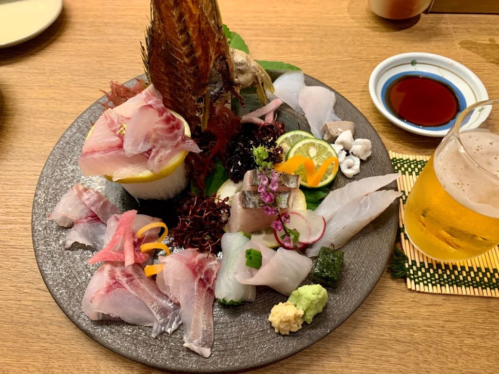 まずはお造りの盛り合わせ。日本海らしく、白身魚とイカのオンパレード。さすがに美味し。ビールとよく合うな。