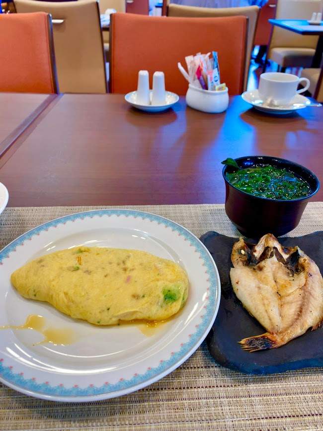 朝が来た。ビュフェの朝食を。いろいろいただいたが・・・メインはこれかな。オムレツとのどぐろ。両方とも、注文してから作ってもらう。できたてで、美味しでした。そういえば今回の旅でのどぐろ食べたの、これが初めてだな。