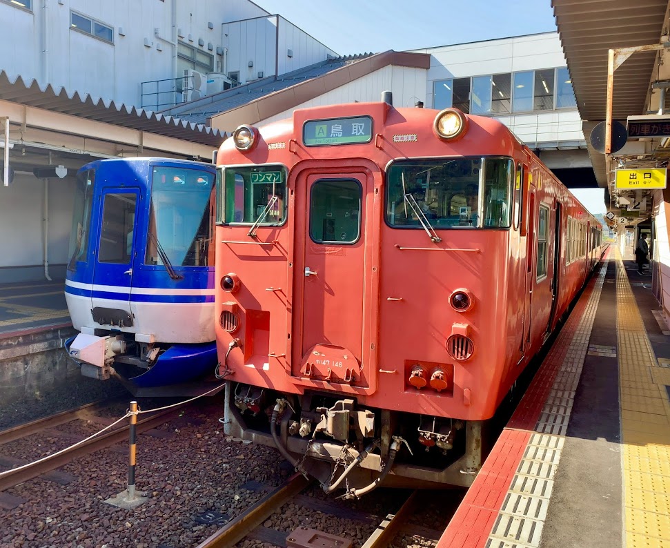 倉吉に到着。ホームには鳥取行きのキハ47鈍行と、左側には特急「スーパーはくと」が止まっていた。さすがに気動車王国らしい最後。ここからリムジンバスに乗って鳥取空港へ。そこから羽田に向かいます。