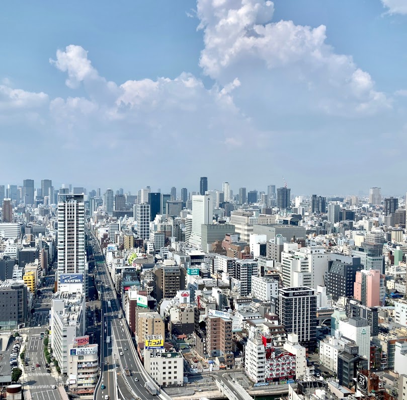 チェックインしたばかりに、ホテルからキタの方向を望む。今日は天気がいいな。外は猛暑だが、ここに来れば冷房が効いて、暑さと無縁となる。天気の良さだけが際立つ。これがまた、いいんだよな。