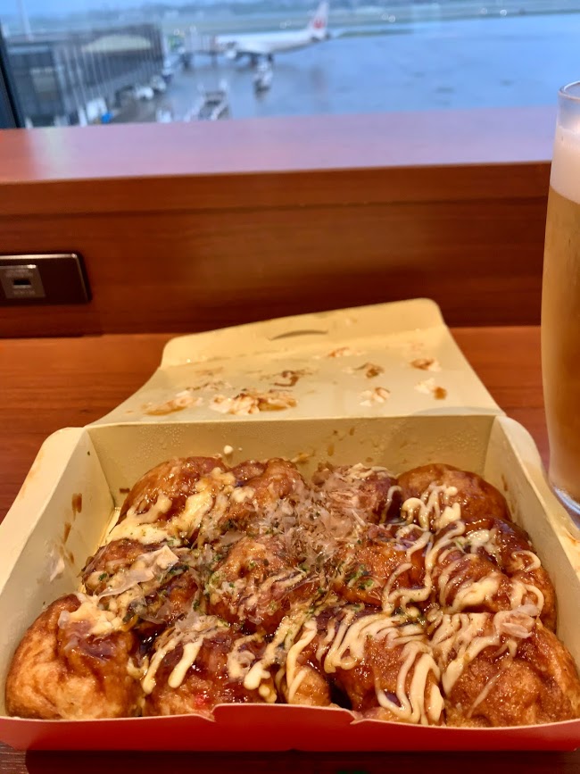 新装なった伊丹空港のJALさくらラウンジで、2時間近く時間をつぶすことに。大阪の最後はたこ焼き。売店で買って、ラウンジで無料ビールとともにいただく。たこやき、中はトロットロ、タコの歯ごたえも最高!美味しな。