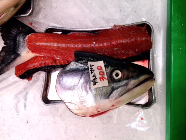 鮭の頭と骨の周りで300円。こういうの買えるのは、市場ならではなんだろな。