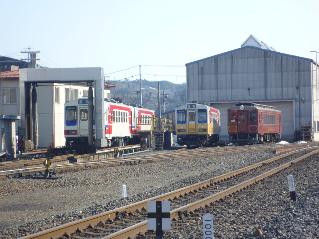 三陸鉄道の久慈駅にて。車庫に止まっている、三陸鉄道の車両たち。左の二両の行き先表示板は、よく見ると、「宮古」と書いてある。津波で流された車両は、この中にあるのか・・・・