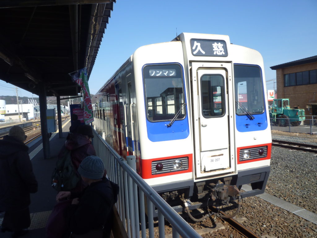 「久慈」と大書きされた行く先表示板文字がなんともやさしく、かわいらしく、かつせつなく感じられる。この後、この気動車は宮古行きに変わり当方が乗車、宮古は浄土ヶ浜旅館を訪ねるのであった。
