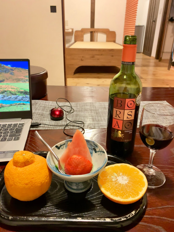 なるほどな・・看板に偽りなし。とにかくおもてなしの極み。とんでもなく素晴らしい宿に泊まってしまったな。明日の朝食も楽しみ。今日はゆっくり眠れそうだ。そんなこと考えながらワイン飲んだり、デザート食べたり、部屋風呂に入ったり。実にまったり。いつしか寝落ち。次回に続きます。