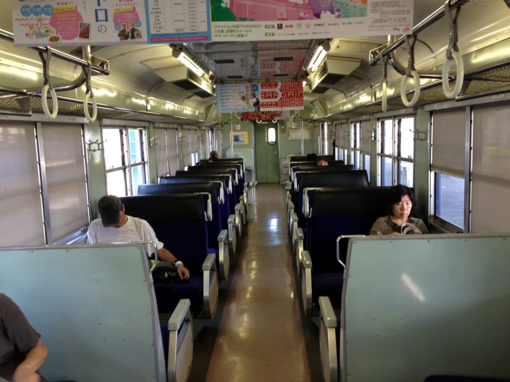 長崎本線、長崎発竹松行きの鈍行に。快速シーサイドライナーの車両を使っている。おそらくは昭和の時代の気動車を、蒼く上塗り塗装した気動車。車内は、昔ながらのボックスシート。国鉄の感じですよね。う~む。ノスタルジックなムード満点。旅情をそそるな。