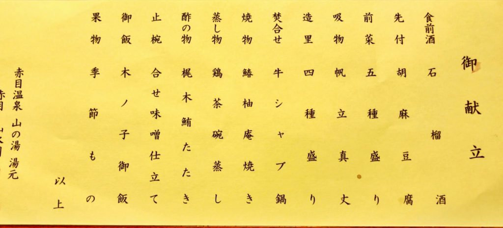 ご参考まで、今宵夕餉のお品書き。アップした以外にも、いろいろと楽しませてもらった。満足。