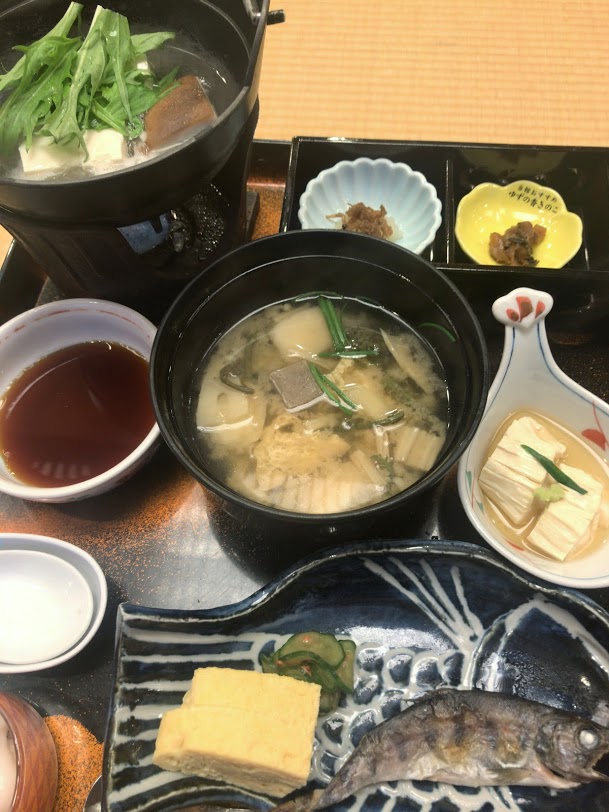 朝食の一部。左から、湯豆腐、山水園特製の具沢山味噌汁・卵焼き・焼き魚(あまご)。夕食と同様、クオリティーが高い。作り置き感がまるでない。旨しだったな。