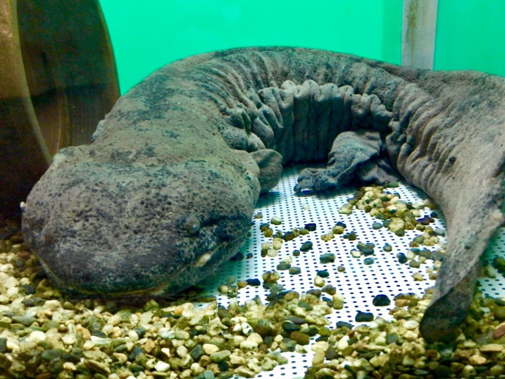 順番が前後するが…赤目四十八滝の入り口に、特別天然記念物オオサンショウウオの水槽が。この川に野生しているらしい。初めてオオサンショウウオを見たけど、これは大物。全長50センチメートル位ある。迫力あるが…意外に愛嬌がある顔してるんだな。世界最大の両生類らしいな。