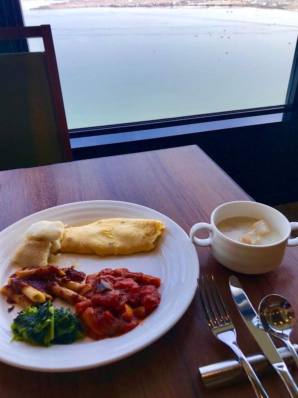 朝餉へ。37Fにあるレイクビューダイニング・Bionaでビュフェを。ここのビュフェには、恐ろしくいろいろな種類の料理が揃っているな。まずは、イタリアンを中心に。右側のスープは琵琶湖のしじみのクラムチャウダーなんだと。しみじみ美味し。温まるな。