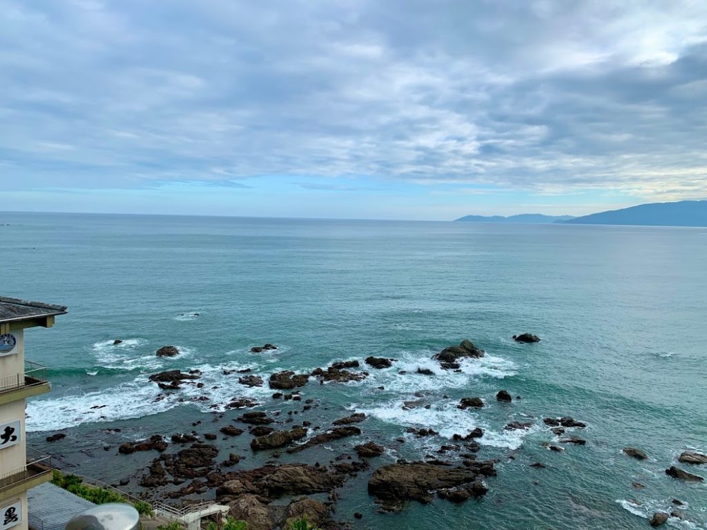 部屋は志布志湾に面している。これはバルコニーから見える志布志湾、太平洋を真南に。う~む。雲が厚いが・・・まあ、きれいだよな。