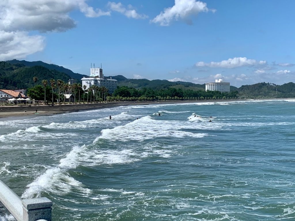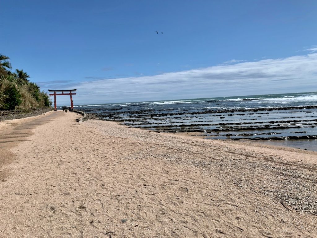 青島神宮の入り口だろうな。青い海と空、そしてカフェオレ色の砂浜がきれいだ。