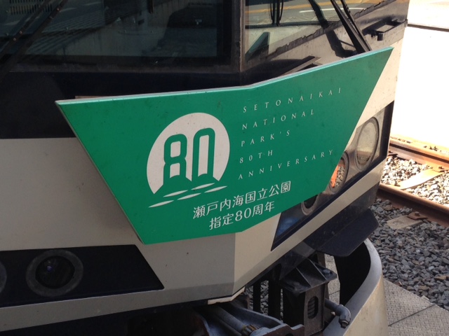 高松駅に到着。瀬戸大橋線岡山に向け、出発を待つマリンライナー。瀬戸内海国立公園50周年記念のプレートが付けられていた。そうなんだ・・・こういうの、テツにはたまらないんだよな。すかざず撮影。
