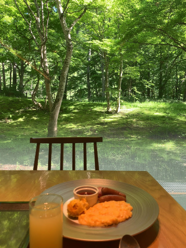 新緑がこんなにキレに広がるレストラン席。素晴らしかった。惜しむらくは写真のピントが景色に合っていて、リンゴジュースとスクランブルエッグとウインナが鮮明ではないな・・・ということで、朝餉の全貌は次の写真を。